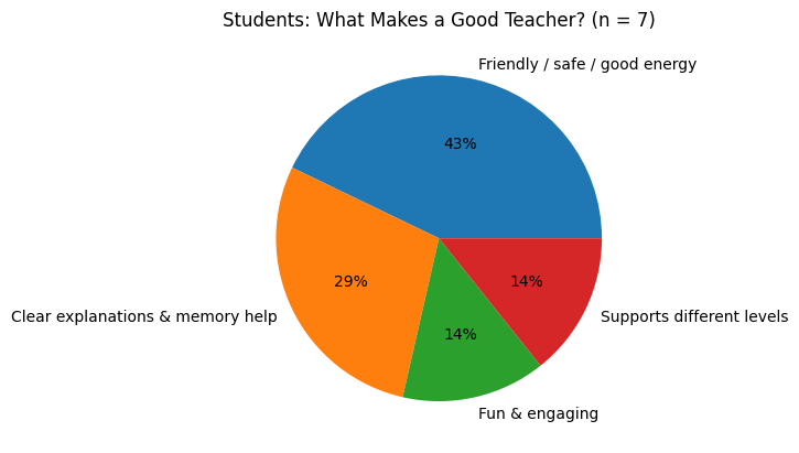 The two pie charts above summarize the most common responses to one question both groups were asked: “What makes a good teacher?”